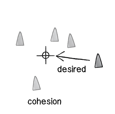 3. Cohesion (also known as “center”) – steer towards the centre of your neighbours (stay with the group):