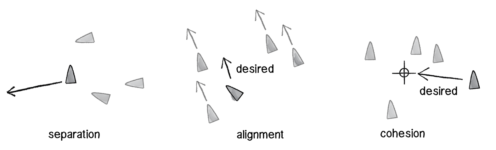 These behaviours allowed individual elements to navigate their digital environments in a “lifelike” manner with strategies for fleeing, wandering, arriving, pursuing, evading, etc.
