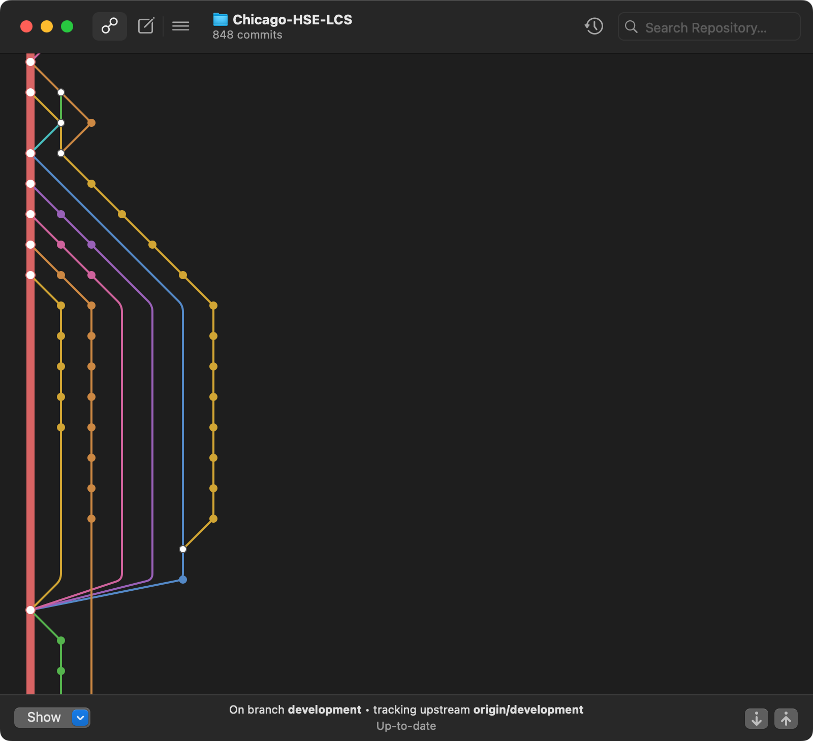 Visually, working on issue branches that are merged into the development branch of a project looks like this: