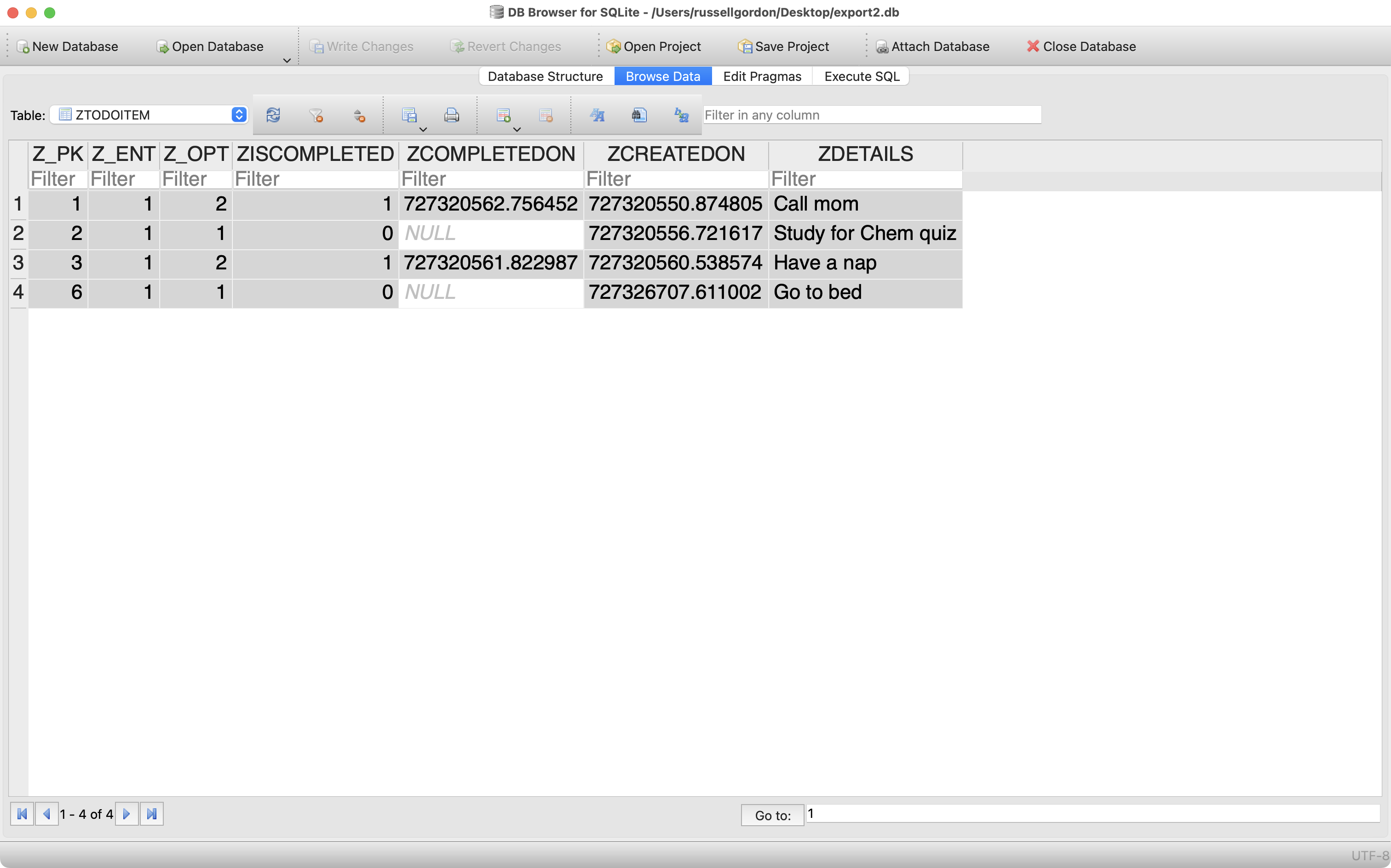 We can run the query right on the database – adjusting somewhat to compensate for the somewhat odd naming convention for tables and columns used by SwiftData: