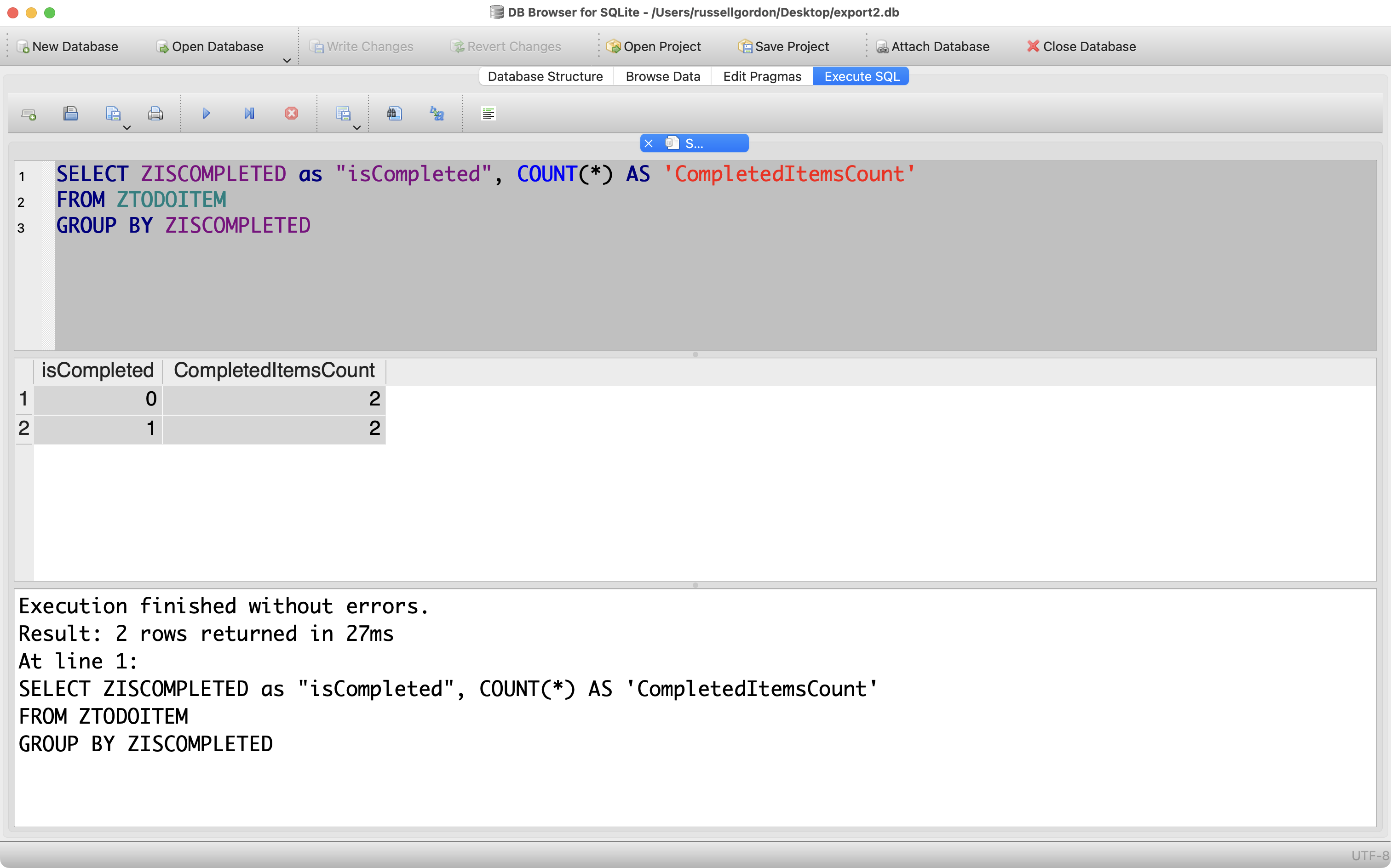 Note that what we are doing here – grouping to-do items by their completion status – and then counting how many they are – is equivalent to writing raw SQL that looks like this: