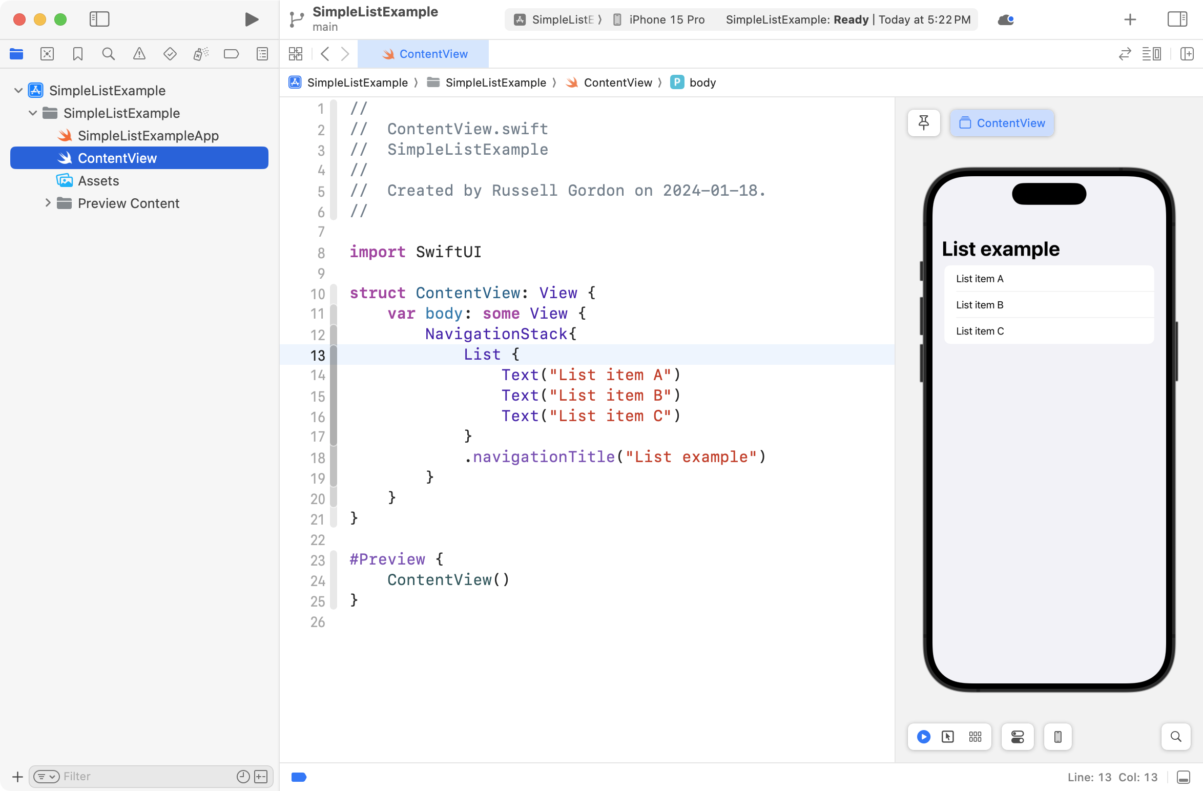 Your view will look odd momentarily, until you enclose the entire ForEach structure in a new List structure, like this: