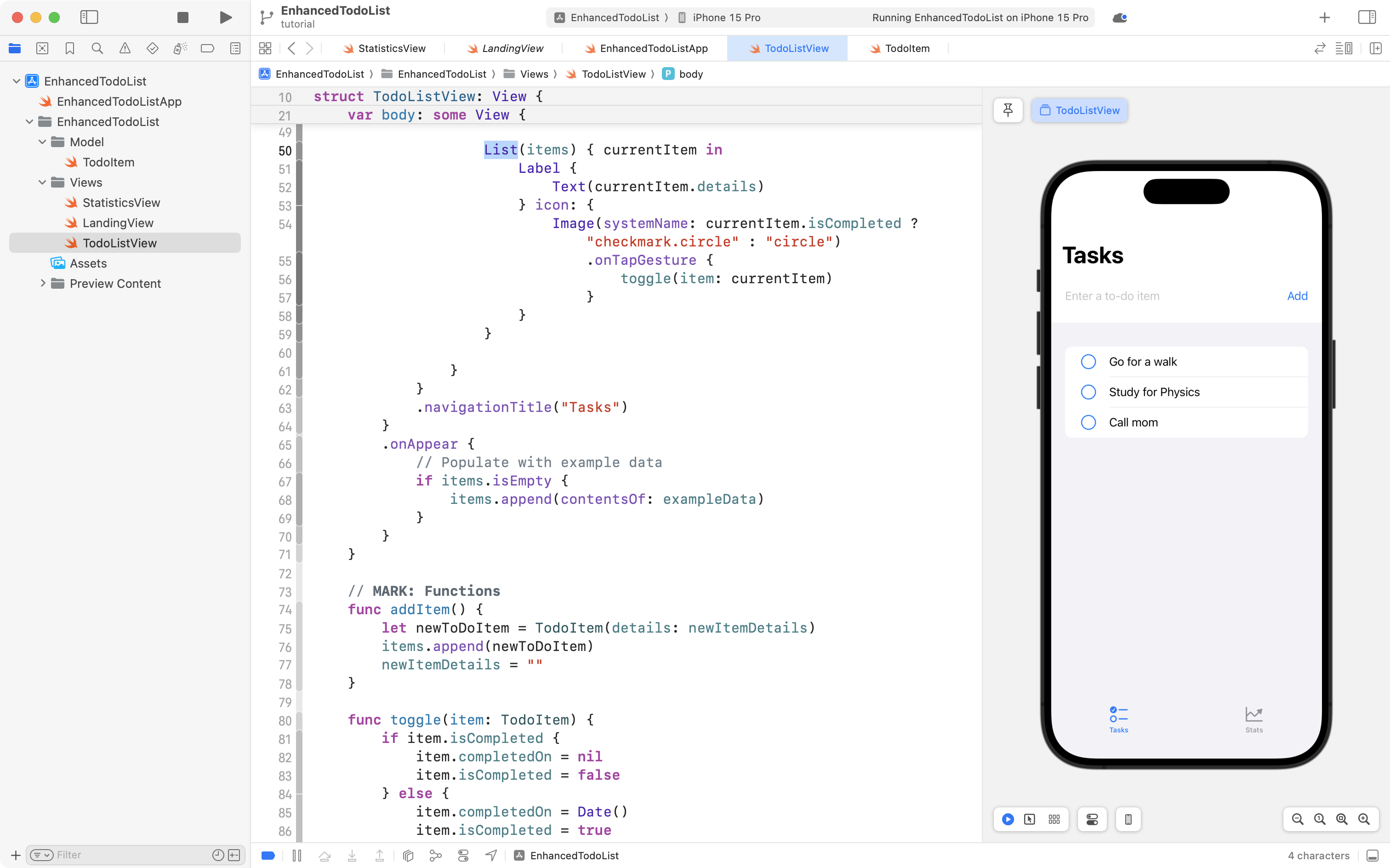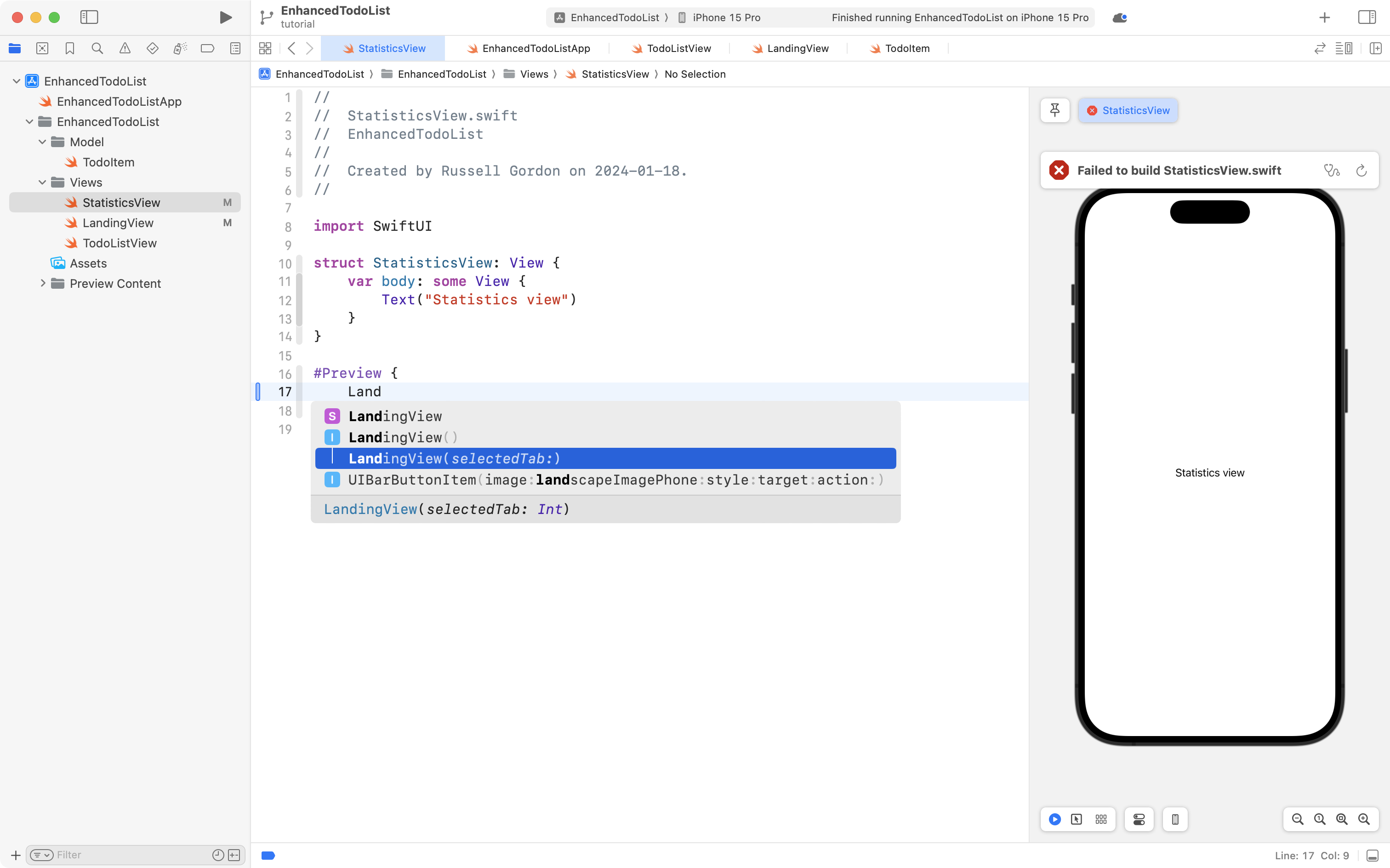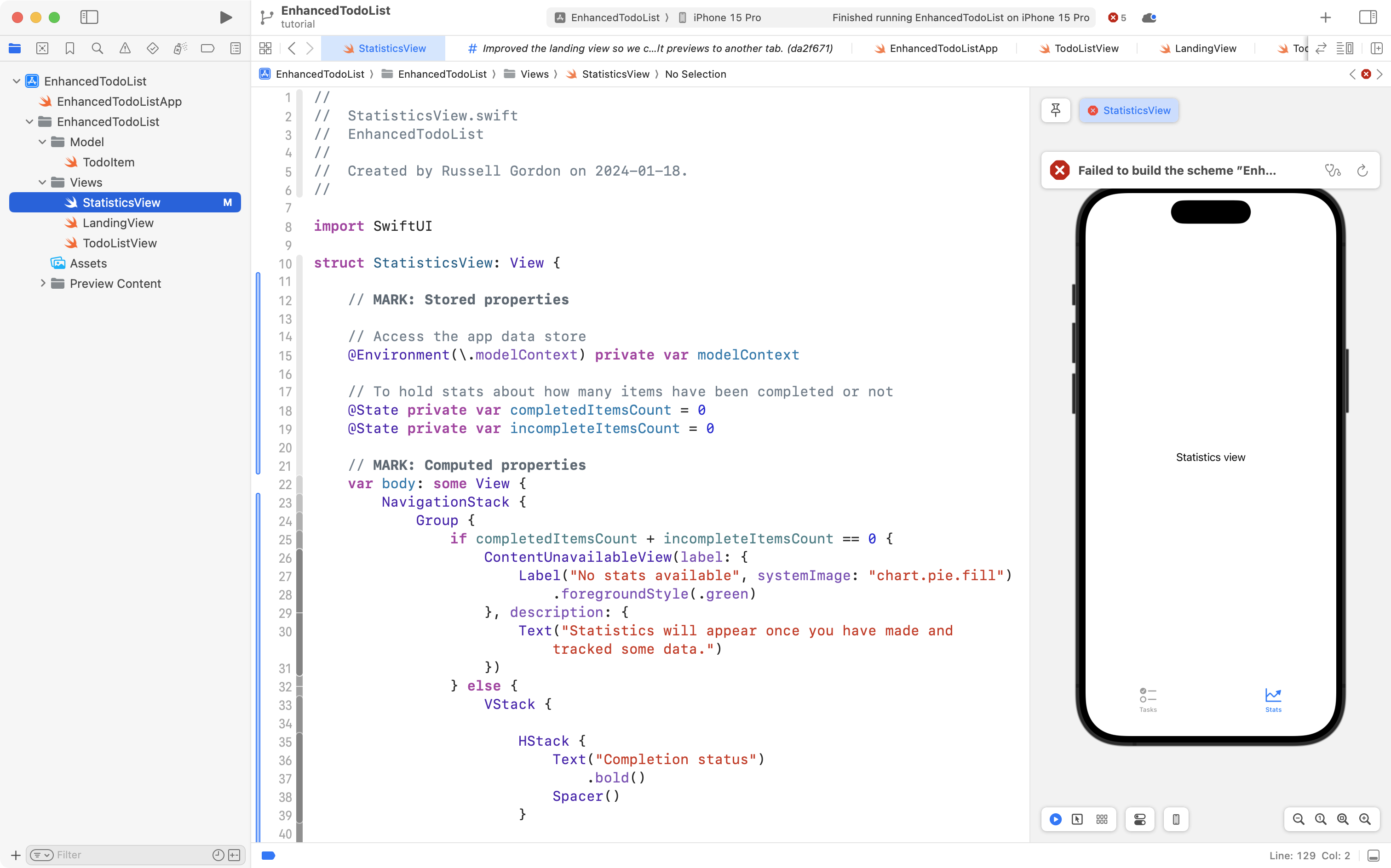 • On lines 32 to 35, we have added an initializer to the LandingView structure. This is a new technique you have not seen before. By default LandingView will present the Tasks tab. However, if a 2 is received by the initializer, the Stats tab will be shown instead.