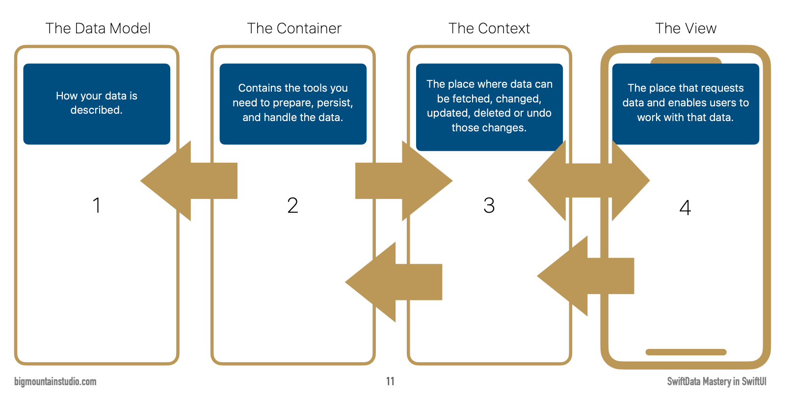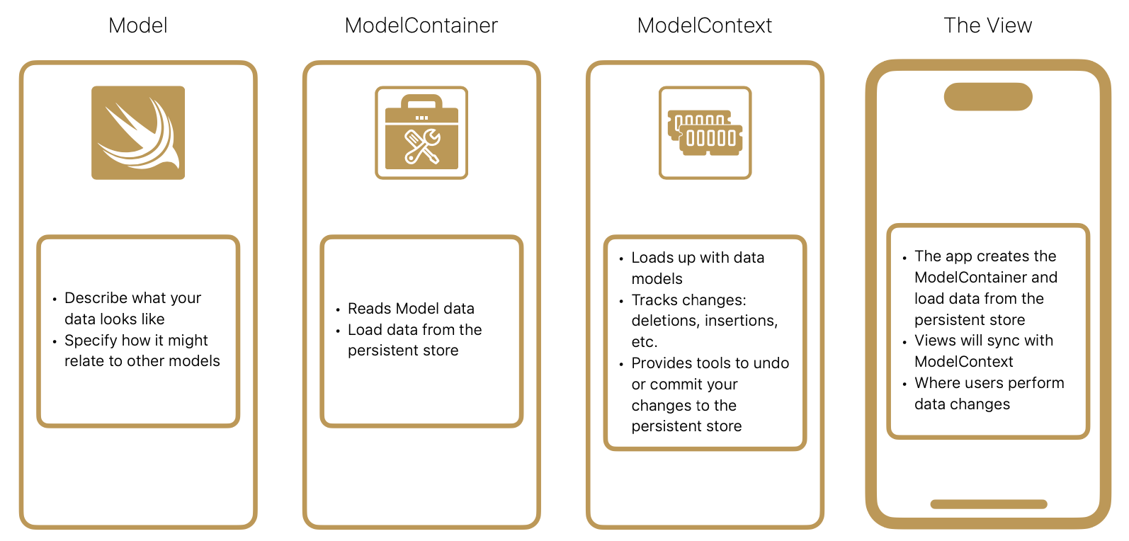 There are four main components that are always used when working with SwiftData in SwiftUI.