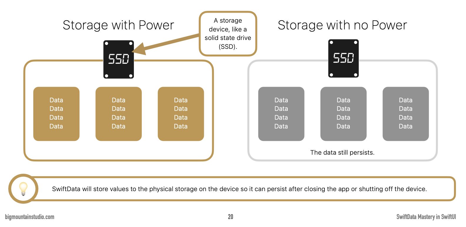 When you hear the word persist that means keep data around – even when power to a device is lost. An iPhone uses a solid state drive or SSD to persist data.
