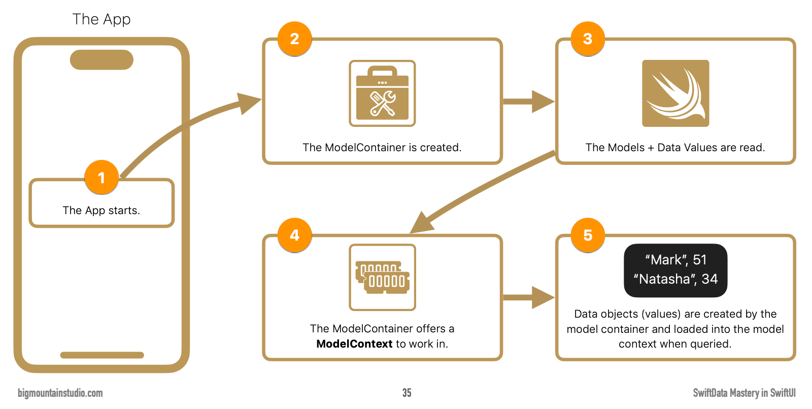 To remind us that the container and context draw their information from the model, Apple has designed the SwiftData framework so that the word model is always present.