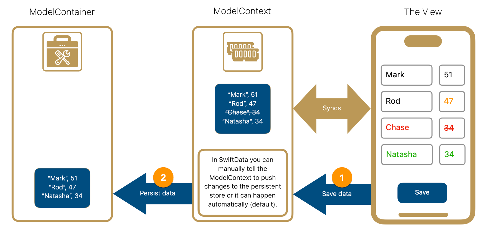 All of this happens in memory, and usually, we let SwiftData decide when to write that data to the container and on to permanent storage. SwiftData ensures that if your app is quit or backgrounded, your data will be persisted.