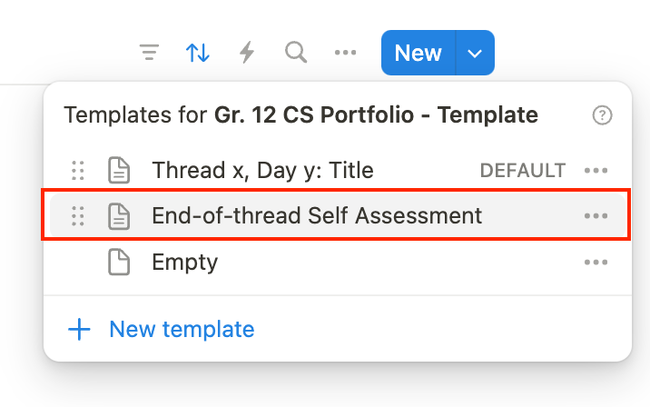 Go to Notion, click the small arrow at right beside the blue New button, then select the End-of-thread Self-Assessment option.