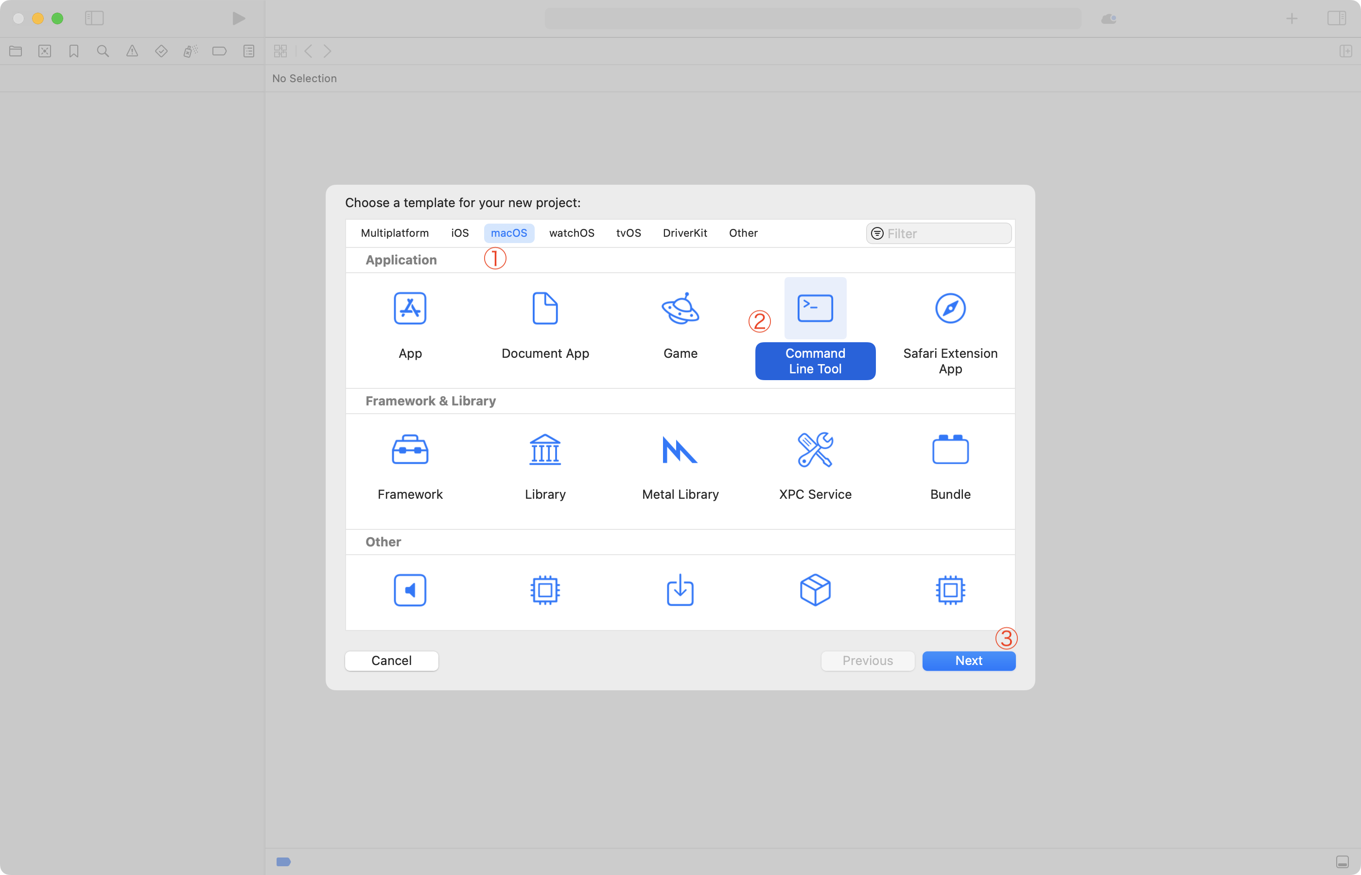 You will see the following window – here, choose the macOS tab, then Command Line Tool, and then Next: